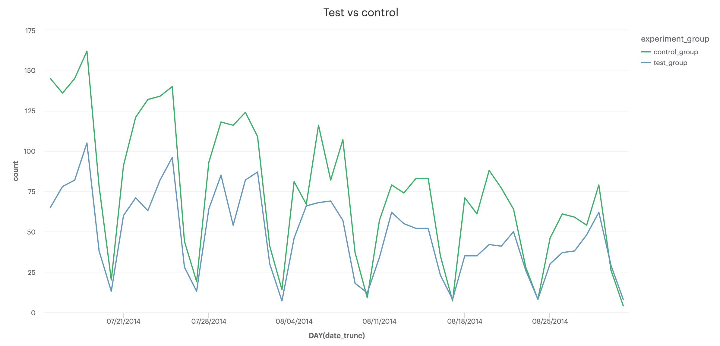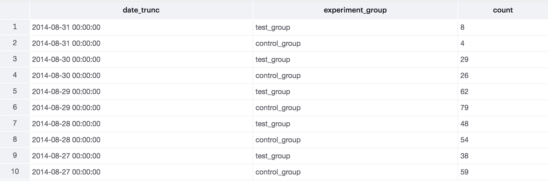 Assuming there was an explicit table tracking test and experiment group assignments, we could look at the results broken out by day by checking the condition of the flag: