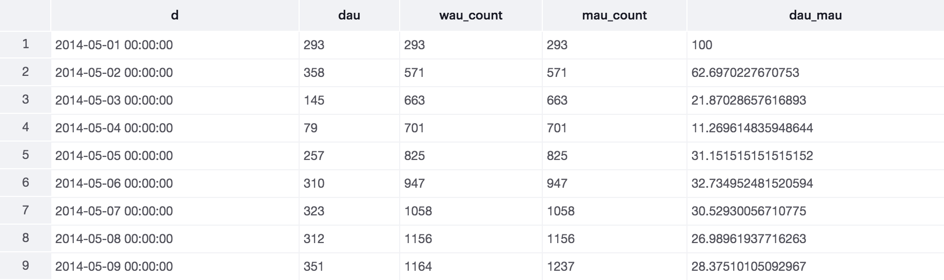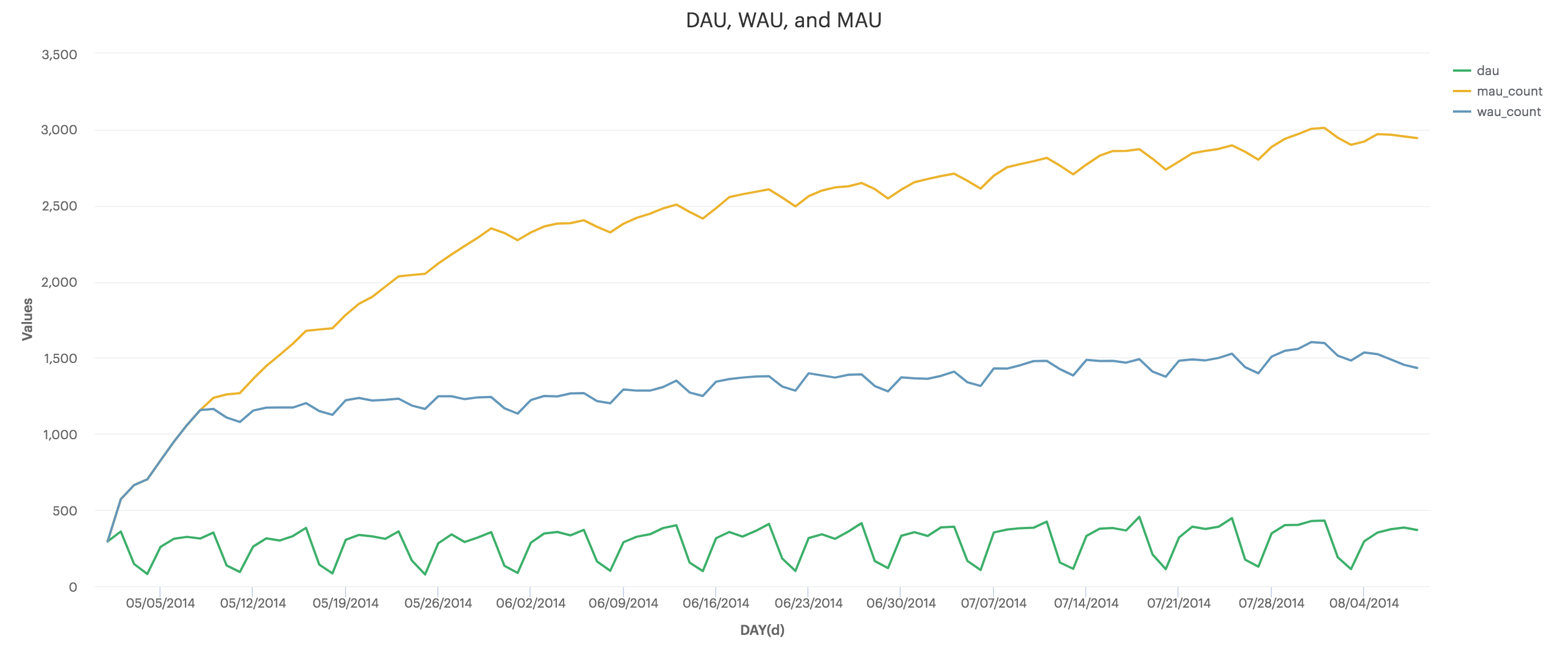 For aggregating active users in other groups such as MAU, we will define the time ranges that we care about relative to the dates for the daily users group.