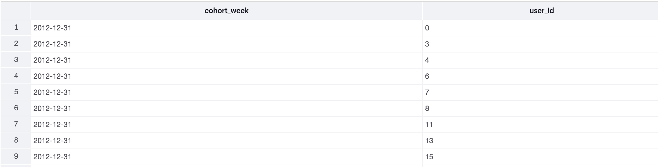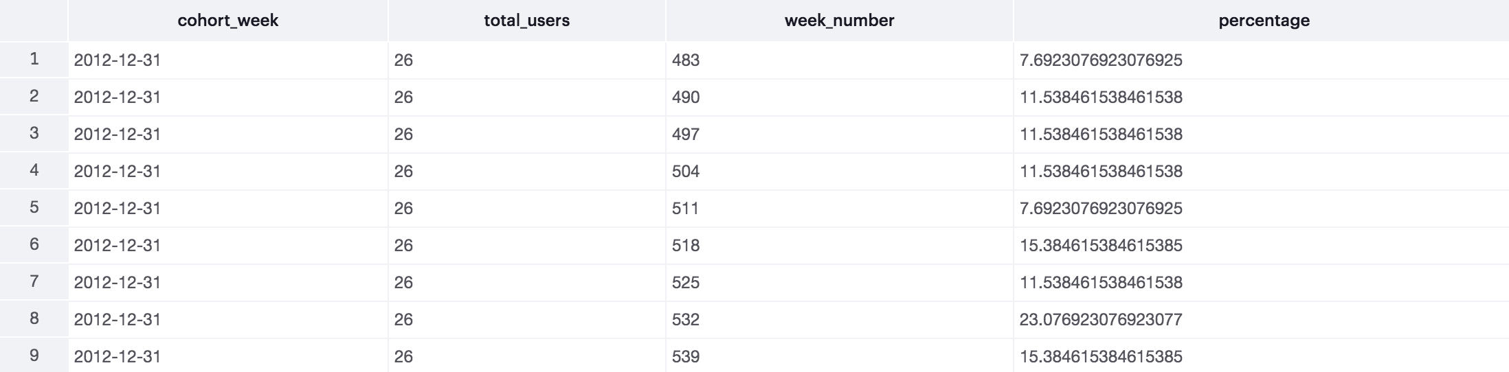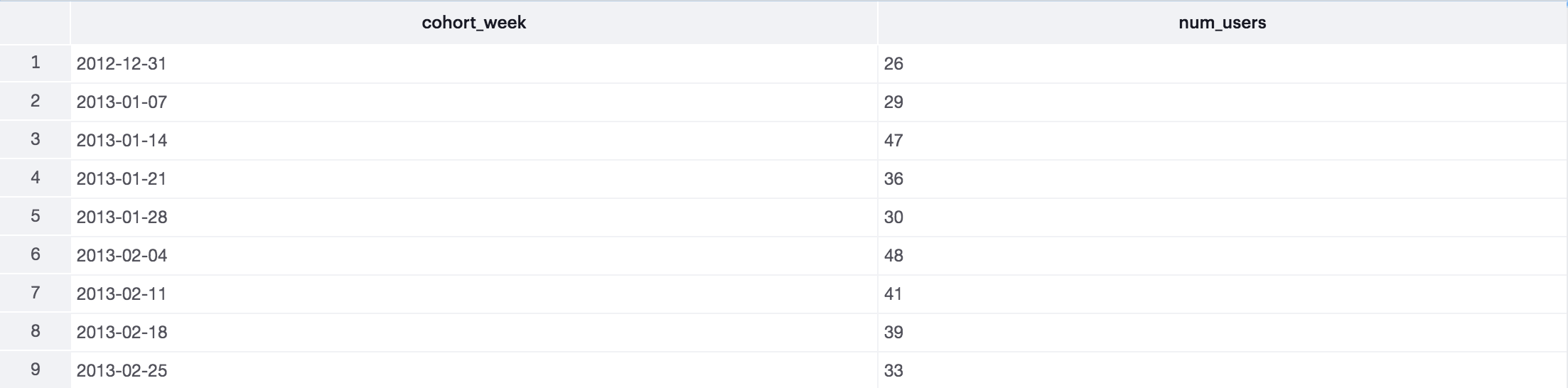 - Aggregate the user activity by cohort and the activity week to get a breakdown of how many users from a cohort were active after a given number of weeks.