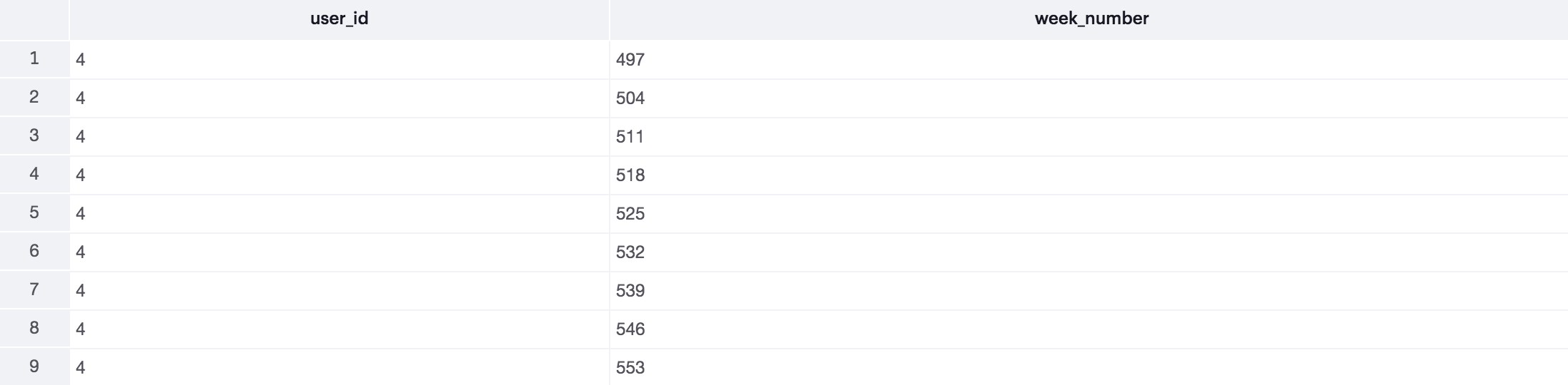 - For each user, track which weeks they were active in. We are going to store the week number as a relative value so that we can compare across cohorts.